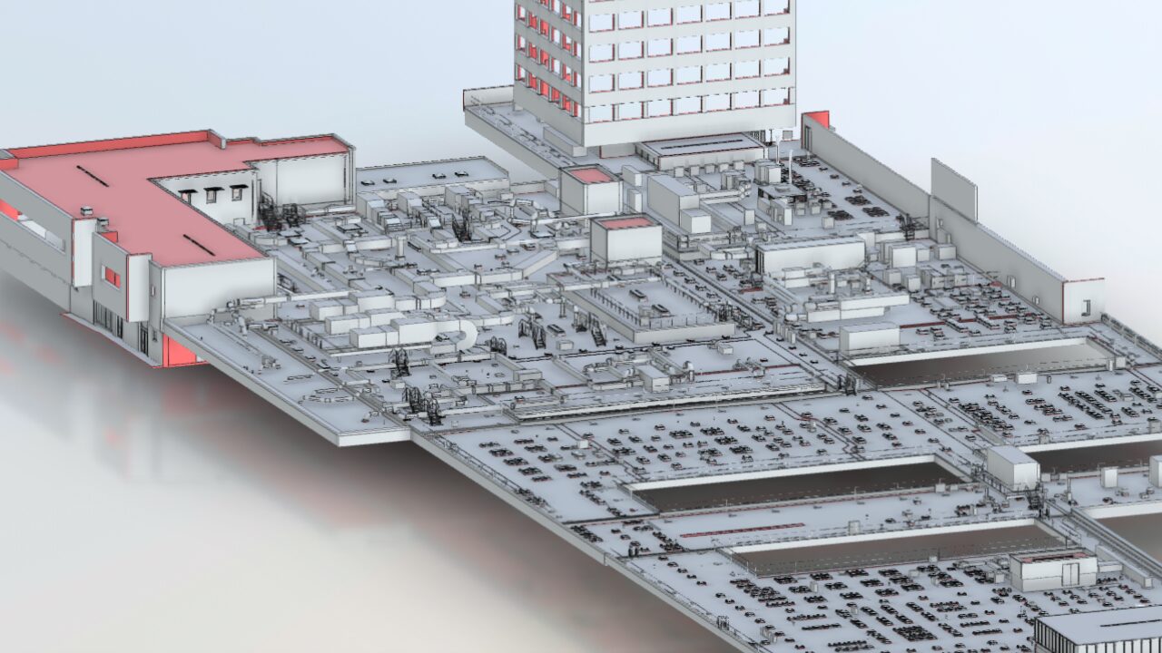 The Trust required accurate, fully coordinated survey data across the whole site, including specific areas such as theatres, the emergency department, and roofs. The surveys needed to reflect the current condition of buildings and external areas.