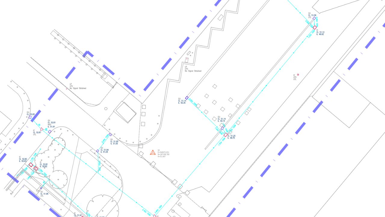 We delivered all underground utility data in 1:100 and 1:200 CAD drawings. These surveys traced, verified, and mapped underground services, reducing the risk of service strikes during construction. Early identification of constraints allowed the design team to plan works safely and avoid costly delays.